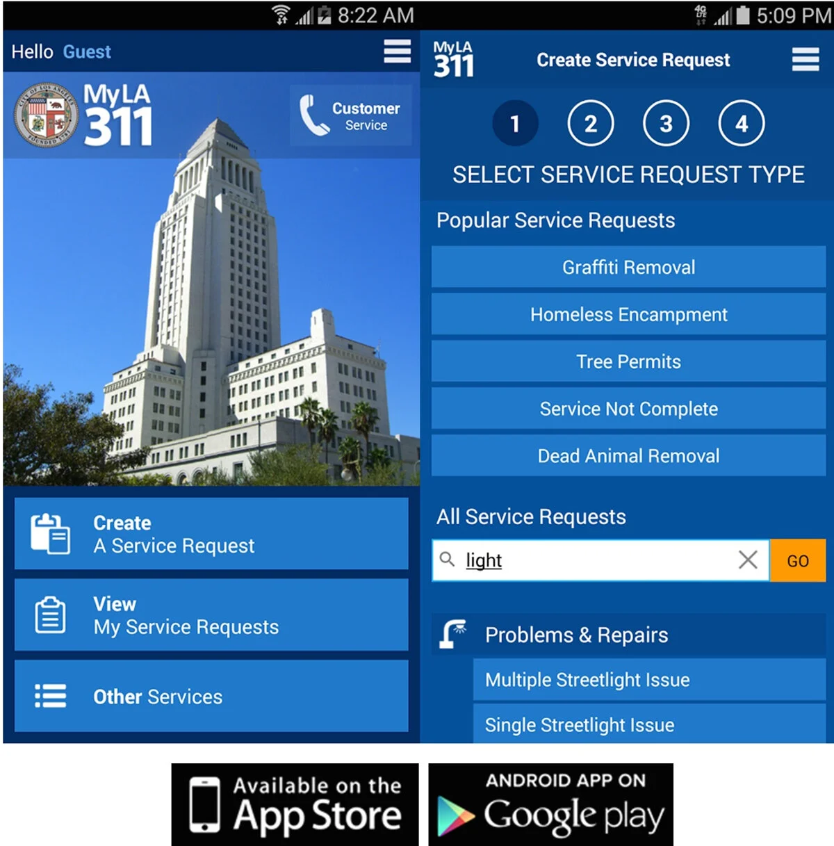 A fast and easy way to report pot holes, graffiti removal, street light issues, etc., is by downloading the MyLA311 application onto your smartphone.
