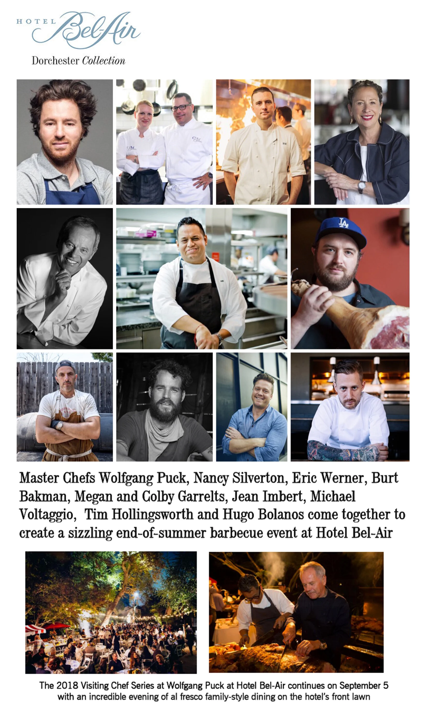 The end-of-summer barbecue extravaganza at Hotel Bel-Air ushers out the festive summer season in style. Master Chef Wolfgang Puck and Executive Chef Hugo Bolanos, are joined by returning chefs Nancy Silverton (Mozza Restaurant Group, Los Angeles, CA) and Eric Werner (Hartwood, Tulum), and welcomes newcomers Burt Bakman (Trudy’s Underground Barbecue, Los Angeles), Megan and Colby Garrelts (Bluestem & Rye, Kansas City), Jean Imbert (L’ACAJOU, Paris), Michael Voltaggio (ink.well, Los Angeles) and Tim Hollingsworth (Otium, Los Angeles) for the ultimate barbecue party on the hotel’s front lawn. This collaborative culinary event will take place on Wednesday, September 5th, at 6pm – 9:30 pm, with guests dining at communal tables amidst lush hotel grounds and colorful gardens. The dinner, priced at $350 per person, includes select wine parings from local California wineries, Lanson Champagne and Class Azul Tequila.