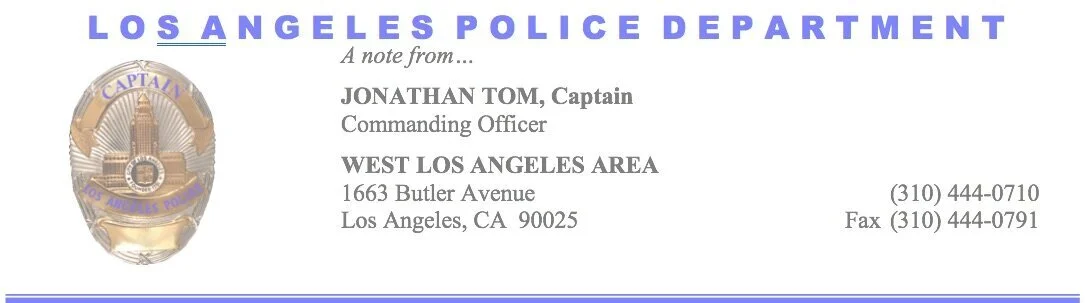 My name is Jonathan Tom and I am the Commanding Officer of the Los Angeles Police Department’s (LAPD) West Los Angeles (WLA) Area. A little background on me: I grew up in Los Angeles, went to University High School and did my probation at West Los Angeles over 20 years ago. As the captain at WLA, I feel compelled to write to you to address some of the concerns that we all have regarding COVID-19, AKA the Corona Virus.